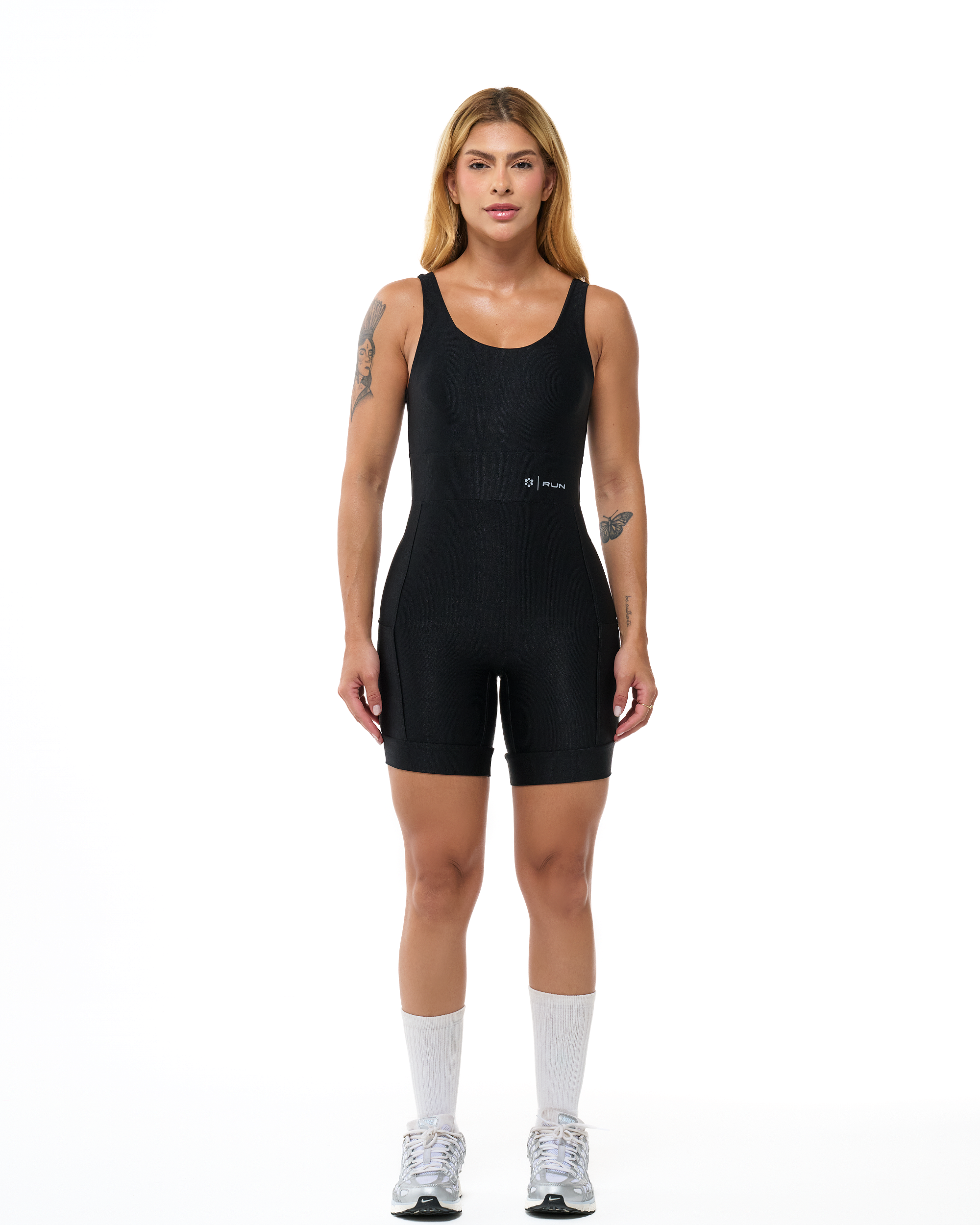 Macaquinho com alta compressão e com efeito liftinge  bolsos nas laterais